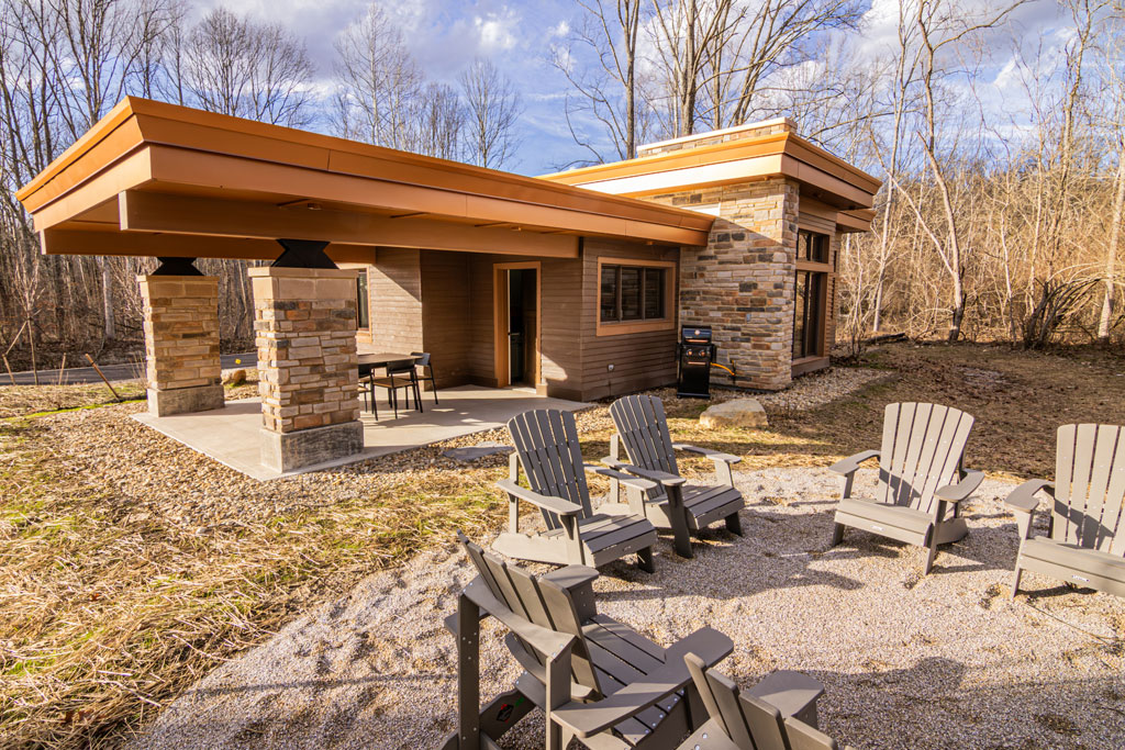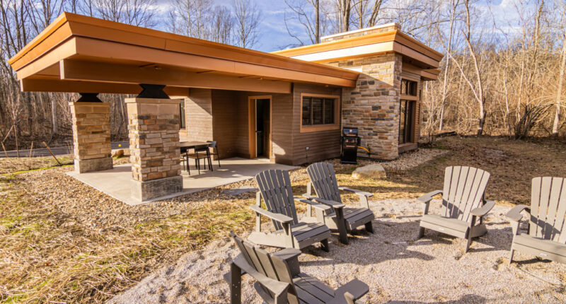 The most visible addition is a set of ten newly constructed cabins—structures that signal a shift in how Ohio presents its state parks. Inspired by the work of Frank Lloyd Wright, these 900-square-foot cabins emphasize horizontal lines, natural materials, and a connection to the surrounding landscape. They sleep up to six and are designed to feel integrated into the terrain rather than placed upon it.