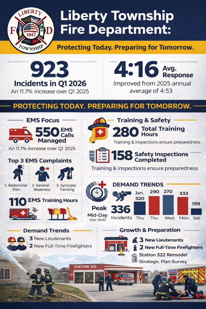 At first glance, the numbers tell a familiar story: more calls, faster responses, steady demand. But behind those figures is something more revealing about the Liberty Township Fire Department’s start to 2026 — a department adapting in real time to rising expectations while continuing to invest in its people, training, and long-term direction.