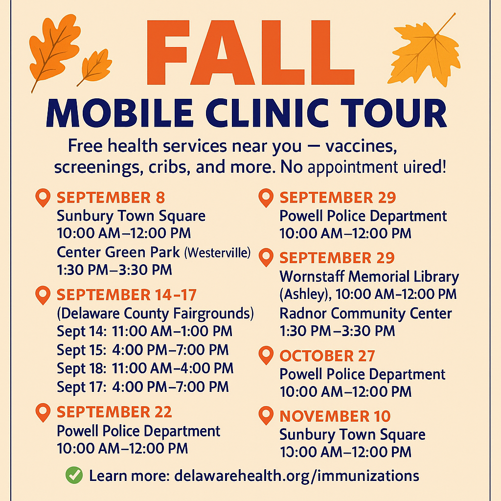 This fall, the Delaware Public Health District is taking health services on the road. From Sunbury to Westerville, the district’s Mobile Clinic Tour is making stops across the county, offering residents convenient access to vaccinations, screenings, cribs, and other resources.