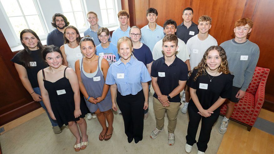 Source: OWU; Ohio Wesleyan’s 2025-2026 Woltemade Economics and Business (WEB) Fellows include 21 first-year students. Front row from left: Reagan Gault, Jules Kyle, Chloe McGee, Abe Parillo, and Ariel Headings. Center row from left: Bailey Terry, Mallory Hannan, Renee Litle, Lela Funk, Aiden Gryzlo, Tanner Hower, and Joey Christy. Back row from left: Brandon DiSavino, Darren Krider, Davis Brewster, TJ Goberville, and Brady Morrell. Not pictured: Jaasiel Dennis, Bailey Hawkins, Chris Restaino, and Simon Stoller. (Photo by Paul Vernon)