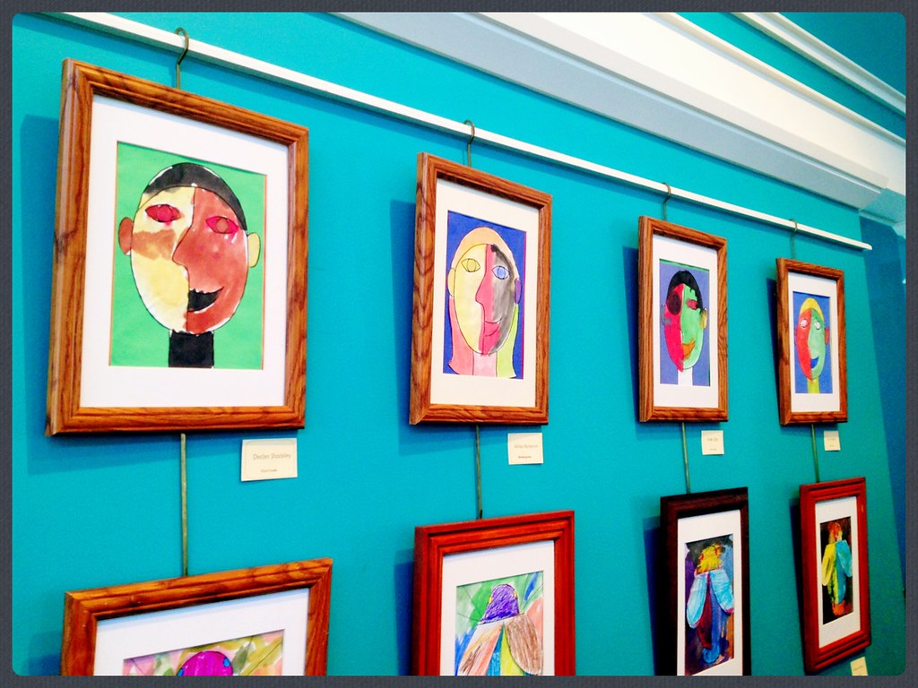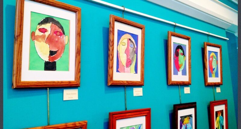 This is not a school hallway display. Student work is presented in a formal gallery setting, with labels and careful placement throughout The Arts Castle’s rooms.